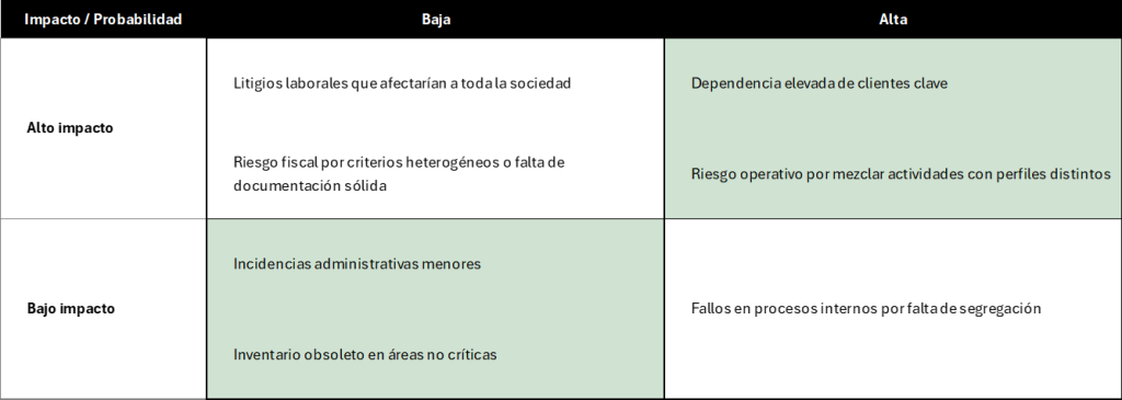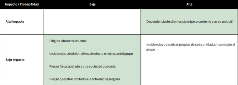 Cuando varias actividades conviven en la misma sociedad, los riesgos se mezclan y pueden afectar a todo el negocio. La matriz inicial muestra cómo esta situación concentra varios riesgos en alta probabilidad y alto impacto, aumentando la vulnerabilidad del grupo.